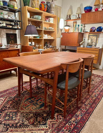 by Arne Hovmand-Olsen and/or Four Teak Dining Chairs by Peter Hvidt, Mid-Century Modern || Table $2200 || L 63” W 33” || Leaves: 18” each || Chairs $2200 — Set of 4