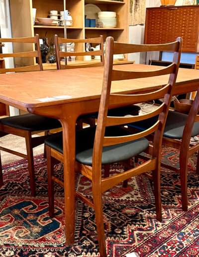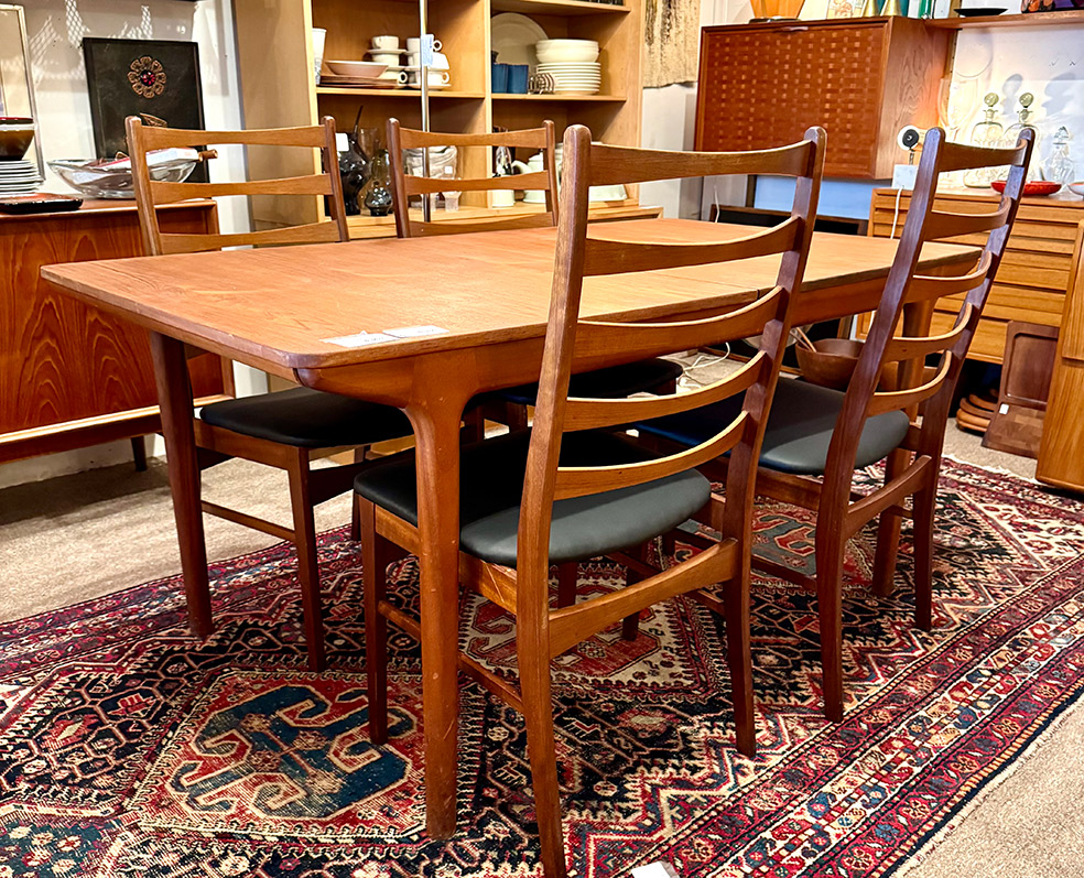with Built-In Leaves, Mid-Century Modern || $1900 || 63” L, 35” W, Two 15” built-in leaves Chairs $1200 set of 4